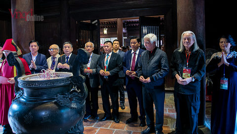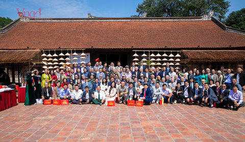 Các nhà sử học và khách mời chụp ảnh lưu niệm tại nhà Bái đường