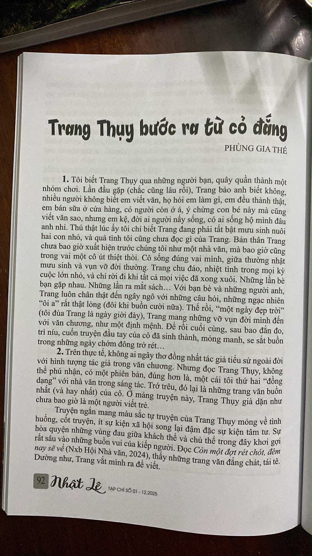 Bản thân Trang chưa bao giờ xuất hiện trước chúng tôi như một nhà văn, mà bao giờ cũng trong vai một cô út thiệt thòi. Cô sống đúng vai mình, giữa thường nhật mưu sinh và vụn vỡ đời thường. Trang chu đáo, nhiệt tình trong mọi kỳ cuộc lớn nhỏ, và chỉ rời đi khi tất cả mọi việc đã xong xuôi. Những lần bè bạn gặp nhau. Những lần ra mắt sách... Với bạn bè và những người anh, Trang luôn chân thật đến ngây ngô với những câu hỏi, những ngạc nhiên “ôi a” rất thật lòng (đôi khi buồn cười nữa). Thế rồi, “một ngày đẹp trời” (tôi đùa Trang là ngày giờ đày), Trang mang những vỡ vụn đời mình đến với văn chương, như một định mệnh. Để rồi cuối cùng, sau bao đắn đo, trì níu, cuốn truyện đầu tay của cô đã sinh thành, mỏng manh, se sắt buồn trong những ngày chớm đông trở rét...
